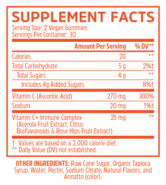 - Vitamin C+ helps promote a healthy immune system + healthy, glowing skin*
